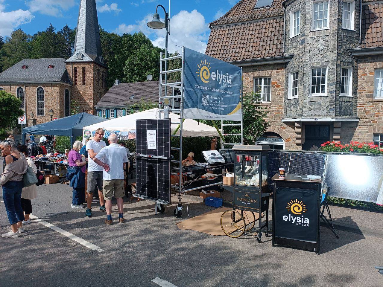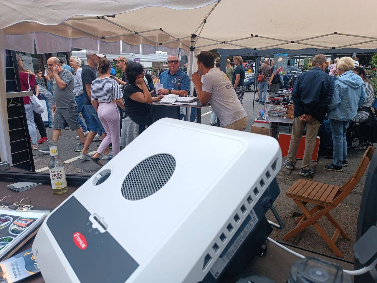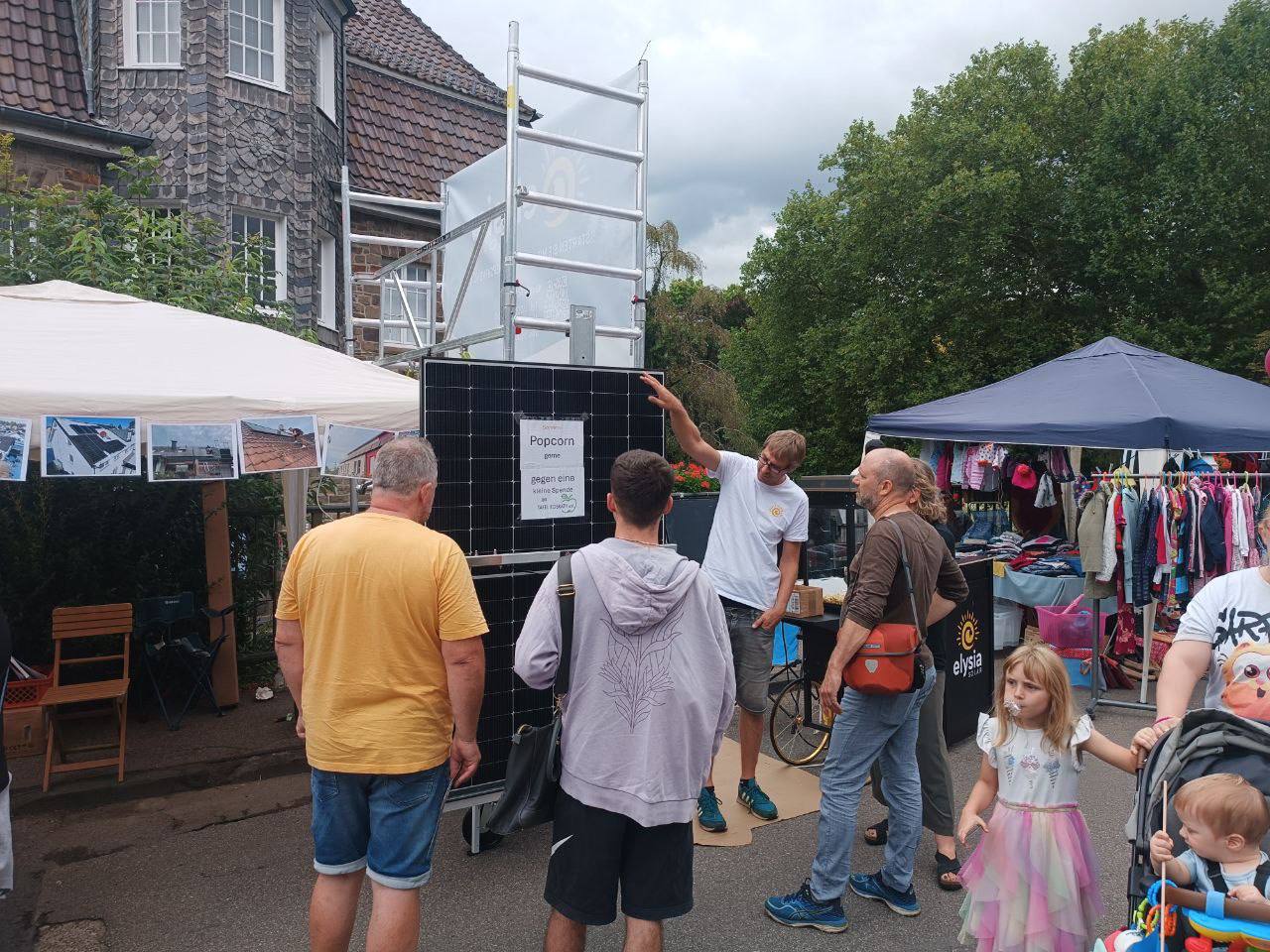 Am 1. September haben wir unseren Stand auf dem Stadtfest am Sülztalplatz aufgebaut. Mit zwei großen Solarmodulen haben wir Strom erzeugt, diesen in einer Batterie gespeichert und damit – wie könnte es anders sein – eine Popcornmaschine betrieben. Natürlich haben wir uns den sonnigsten Platz gesichert, aber bei über 30 Grad im Schatten war das nicht unbedingt die beste Idee!